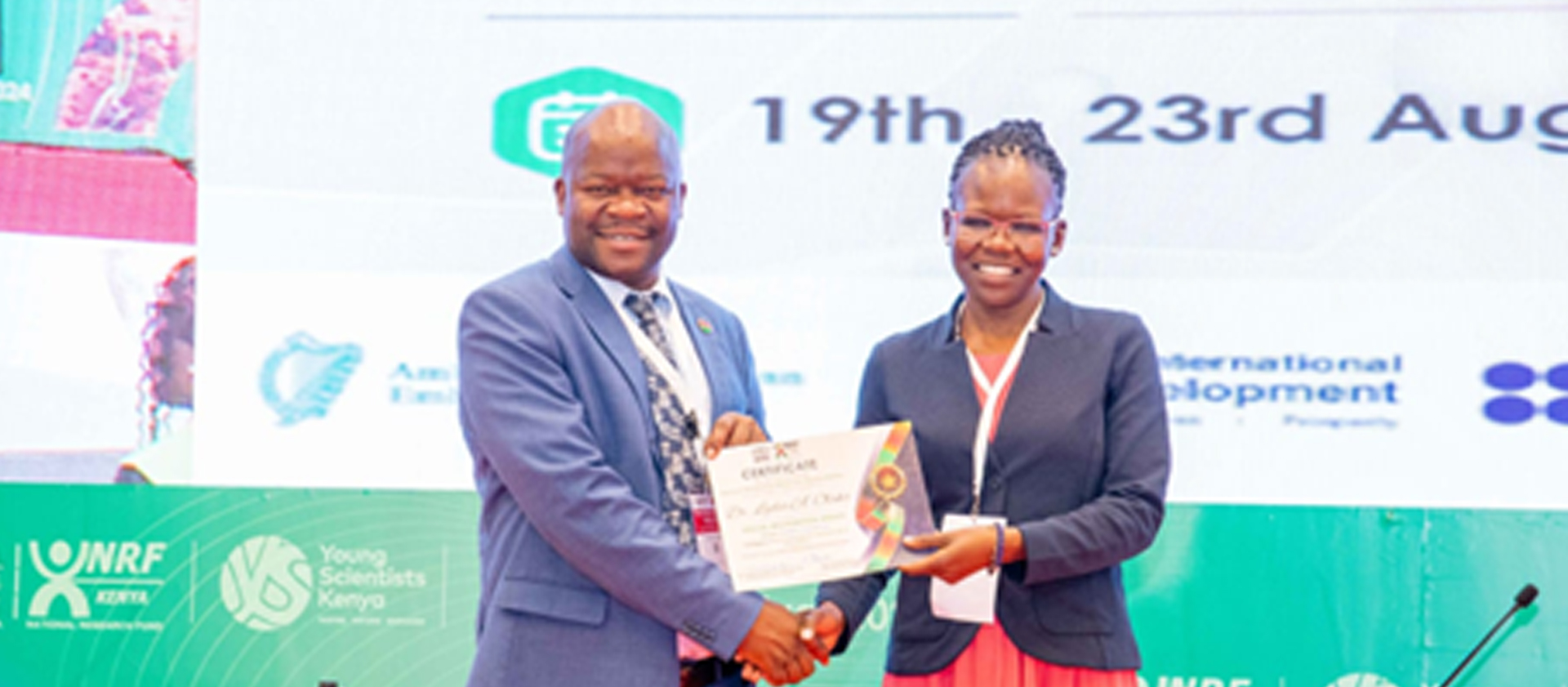 Dr. Lydia Olaka was nominated and selected for the National Outstanding Woman Researcher in Physical Sciences, Technology and Innovation Sector. She received the award during the inaugural National Outstanding Research Awards (NORA), organized by National Research Fund (NRF) during the Kenya National Research Festival (KNRF) held on 23rd August, 2024.
