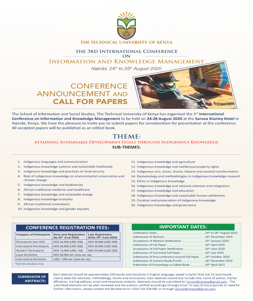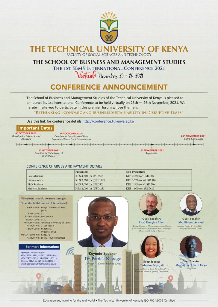 The School of Business and Management Studies of the Technical University of Kenya is pleased to announce its 1st International Conference which will be held Virtually on November 25–26, 2021, as a premier forum for the presentation of research papers on the theme “Rethinking Economic and Business Sustainability in Disruptive Times” organized into Tracks and Topics. This is a prestigious conference organized to provide an international platform for the academicians, researchers, public and private participants and students to share their research findings on how to navigate among other disruptions, Covid-19 occasioned business disruption. All full paper submissions will be peer reviewed and evaluated based on originality, technical and/or research depth, accuracy and relevance to the conference. Additionally, qualifying papers will be considered for publication in the School’s refereed journal as per our publications policy.